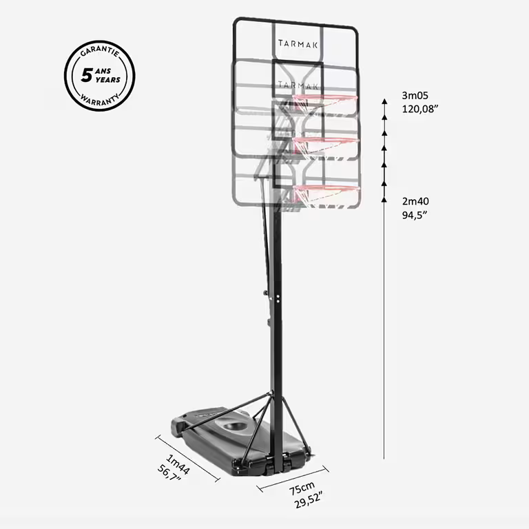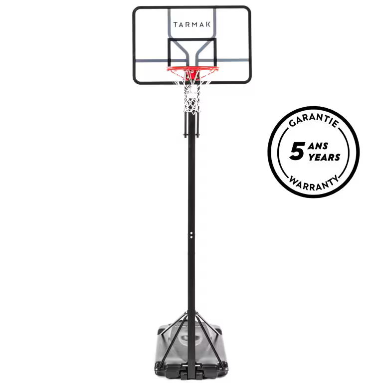 This basketball basket offers excellent bounce quality thanks to the polycarbonate backboard. It can be adjusted to 7 heights with just one hand: from 2.40m to 3.05m & with a flexible hoop for dunking